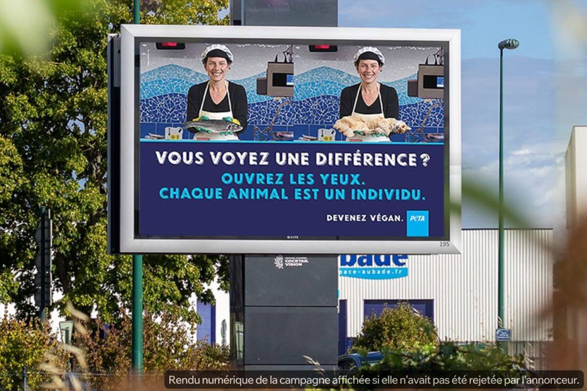 Côtes-d’Armor, Morbihan et Ille-et-Vilaine – À l’occasion de la Journée mondiale pour la fin du spécisme, PETA avait prévu de déployer en Bretagne, première région française de pêche, une campagne d’affichage choc. Mais l’entreprise publicitaire a refusé de la diffuser, alors même que des publicités montrant des animaux morts destinés à la consommation sont régulièrement visibles dans l’espace public.