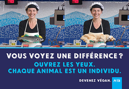 L’affiche de PETA montre une poissonnière tenant un poisson mort, puis la même scène avec un chat ; le slogan interpelle : « Vous voyez une différence ? Ouvrez les yeux. Chaque animal est un individu. Devenez végan. » L’objectif : rappeler que la valeur d’une vie ne dépend pas de l’espèce à laquelle appartient un animal. La campagne visait à encourager les habitants à considérer les poissons comme les êtres intelligents et sensibles qu’ils sont et à opter pour une alimentation végane.